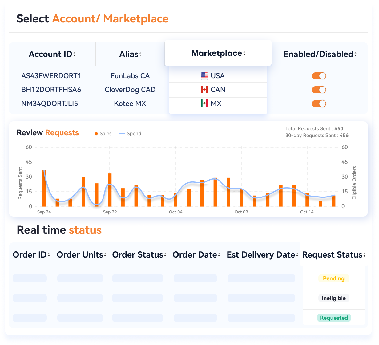 Send review request emails to the customers automatically right after new purchases are completed. Have an overview of orders and requests sent across multiple marketplaces and accounts, and keep tracking the request status of each order.
